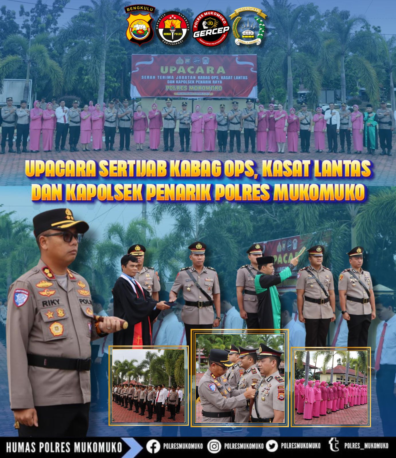 Upacara Sertijab ini meliputi pergantian jabatan Kabag Ops, Kasat Lantas, serta Kapolsek Penarik Raya. Kegiatan berlangsung dengan khidmat dan diikuti oleh para pejabat utama, perwira serta personel Polres Mukomuko.