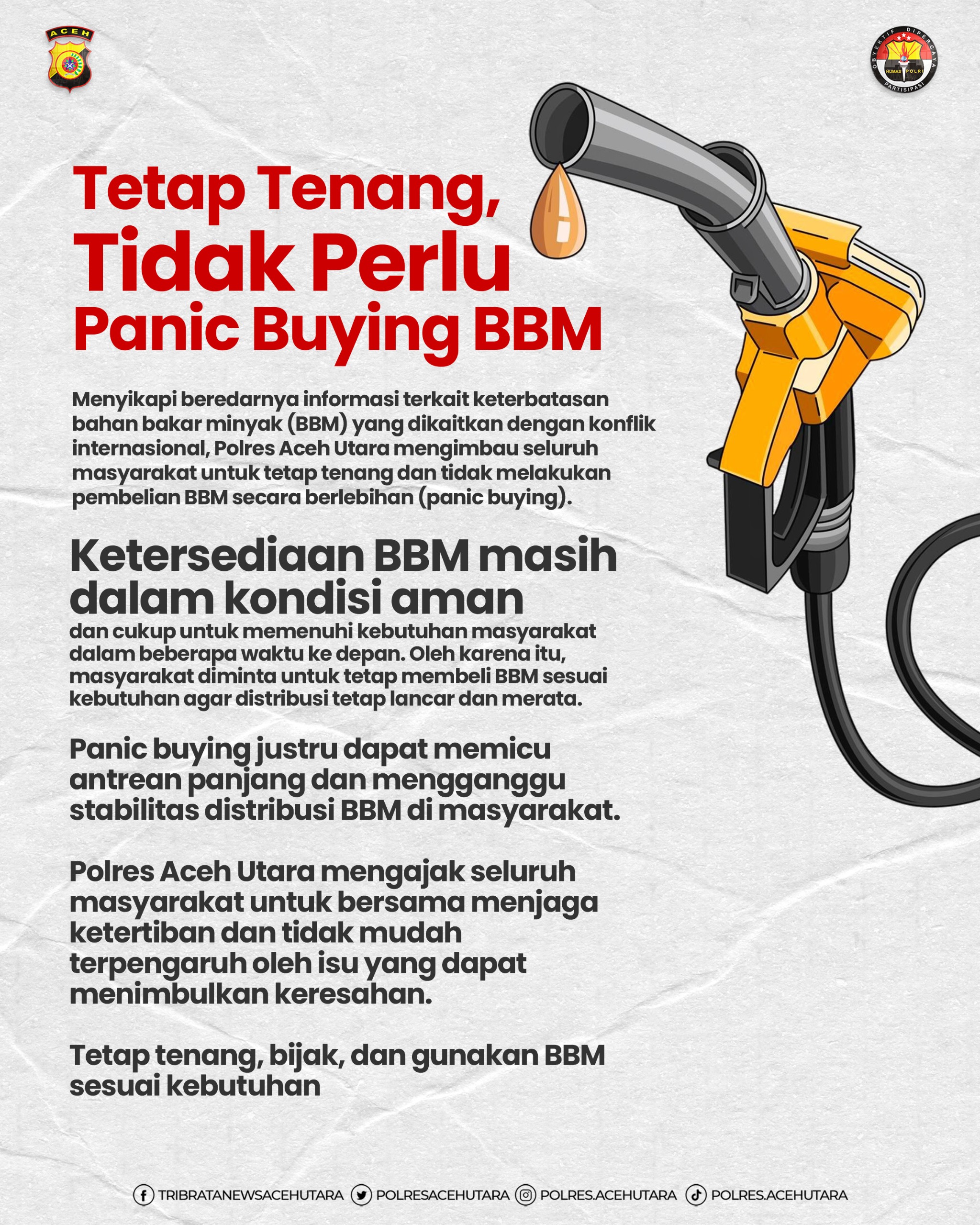 Kapolres Aceh Utara AKBP Trie Aprianto, S.H., M.H mengatakan masyarakat tidak perlu khawatir terhadap ketersediaan BBM, karena hingga saat ini stok BBM masih dalam kondisi aman untuk memenuhi kebutuhan masyarakat dalam beberapa waktu ke depan.