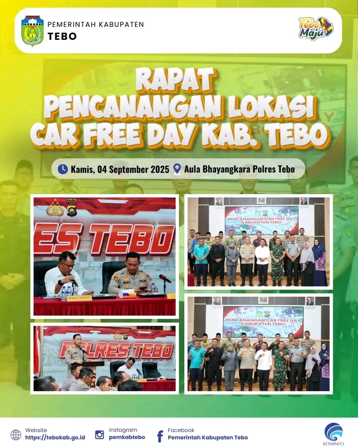 Tebo, 4 September 2025 – Wakil Bupati Tebo, H. Nazar Efendi, SE., M.Si., menghadiri rapat perencanaan rute Car Free Day (CFD) Kabupaten Tebo yang digelar di Mapolres Tebo pada Kamis (4/9).