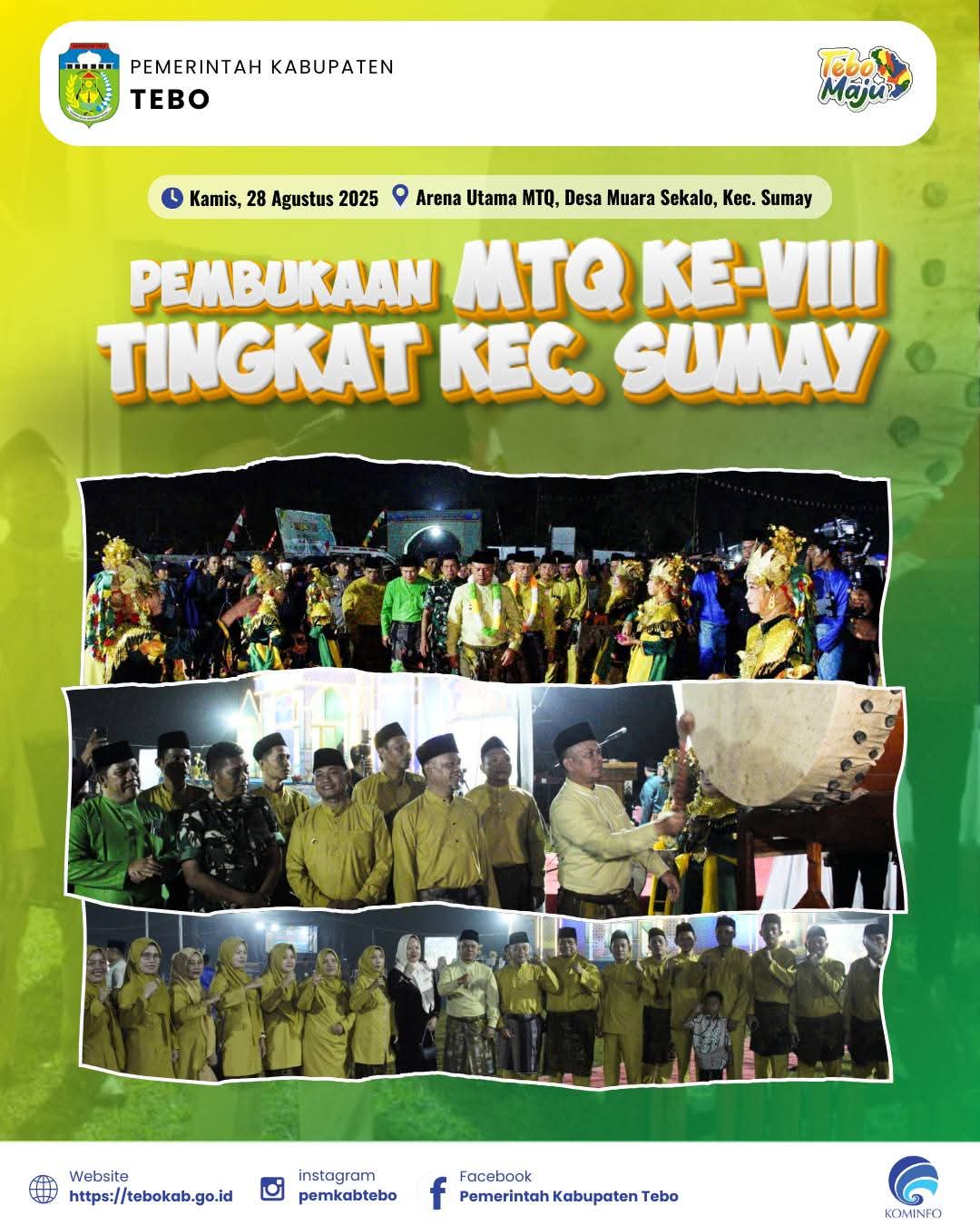 Pembukaan MTQ berlangsung meriah dengan dihadiri unsur Forkopimda, para camat, kepala desa, tokoh agama, tokoh masyarakat, serta kafilah dari berbagai desa di Kecamatan Sumay. Pemerintah Kabupaten Tebo berharap pelaksanaan MTQ ini dapat menjadi tradisi keagamaan yang terus berkembang, sekaligus memberikan kontribusi dalam mewujudkan masyarakat Tebo yang religius, berbudaya, dan berkarakter.(edi enjoy)