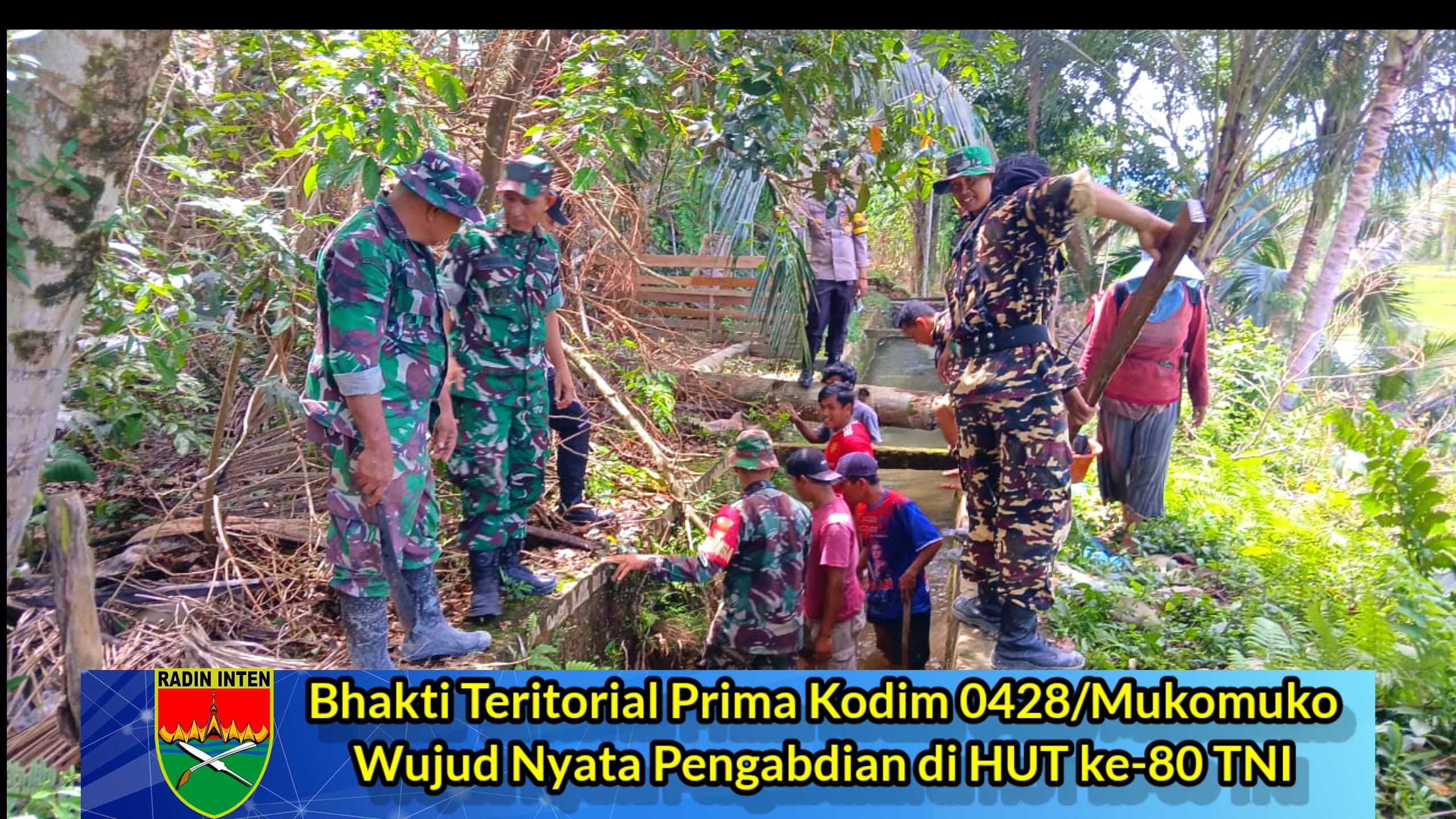 Mukomuko.Faktanews24.Com- Personel Kodim 0428/Mukomuko langsung melaksanakan bergabung dalam aksi bersih-bersih serta “Gotong Royong Perbaikan Irigasi” Desa Pondok Baru Kec. Selagan Raya Kab. Mukomuko, Selasa(23/09/2025).