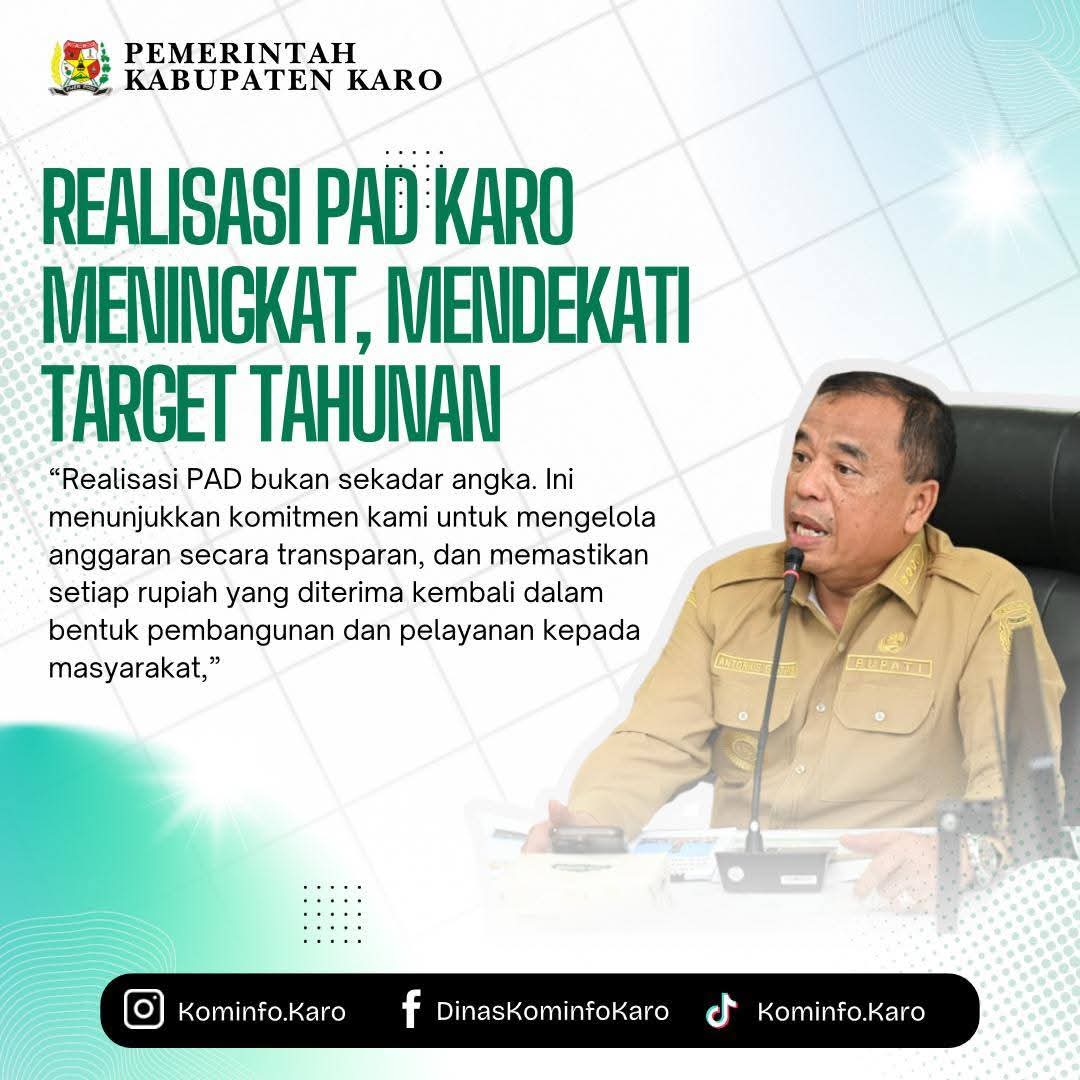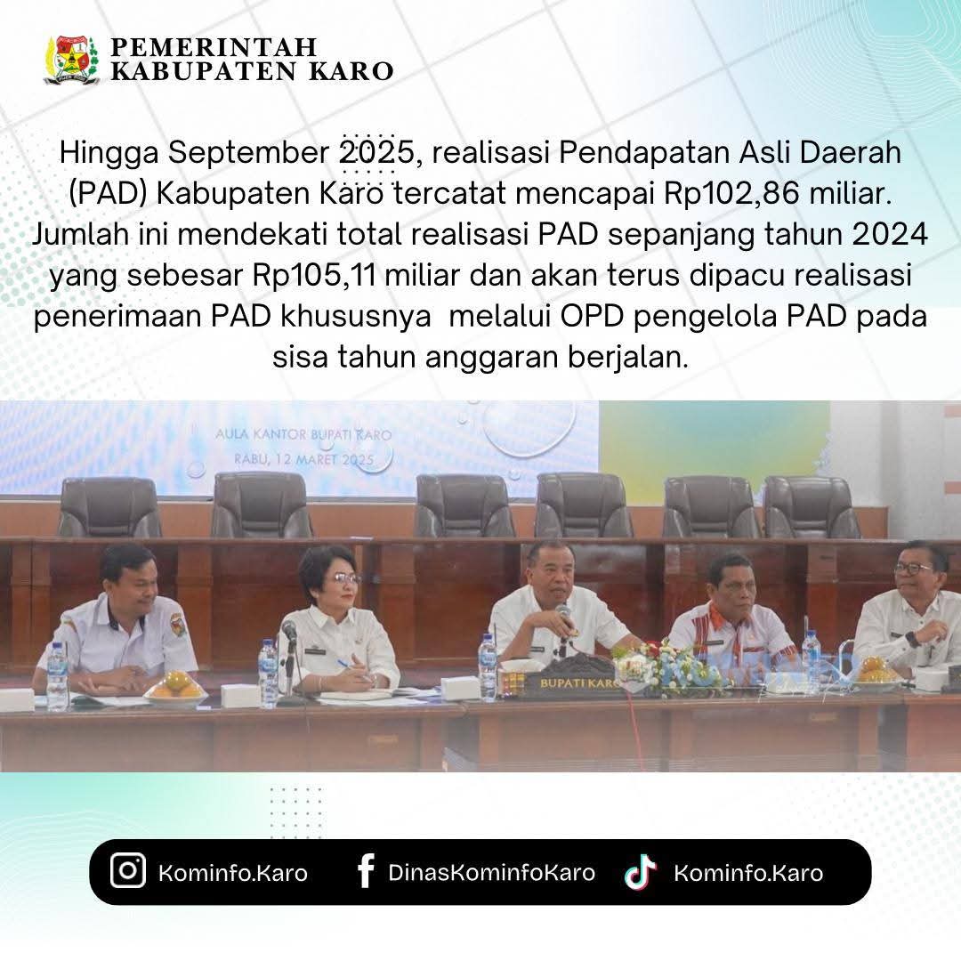 Hingga September 2025, realisasi Pendapatan Asli Daerah (PAD) Kabupaten Karo tercatat mencapai Rp102,86 miliar. Jumlah ini mendekati total realisasi PAD sepanjang tahun 2024 yang sebesar Rp105,11 miliar dan akan terus dipacu realisasi penerimaan PAD khususnya melalui OPD pengelola PAD pada sisa tahun anggaran berjalan.