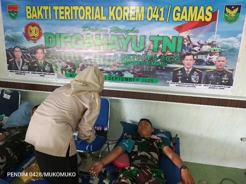 Komandan Kodim 0428/Mukomuko Letkol Inf Yokki Firmansyah Menyampaikan,” Dalam rangka memperingati HUT TNI ke-80, Kodim 0428/Mukomuko melaksanakan Kegiatan Donor Darah. Bertema “ Bakti Teritorial Prima ”. Sejalan dengan semangat tersebut, kegiatan donor darah hari ini merupakan wujud kepedulian TNI terhadap sesama dan bukti nyata kemanunggalan TNI dengan rakyat. Setetes darah yang kita sumbangkan bukan hanya menyelamatkan nyawa, tetapi juga mempererat ikatan kebersamaan antara TNI dan masyarakat.