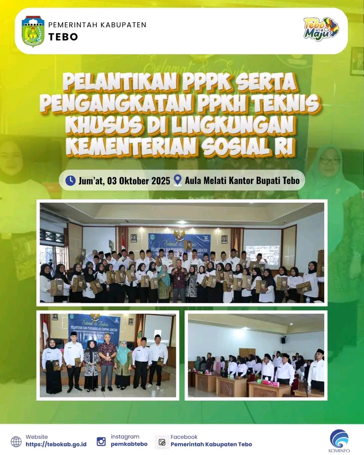 TEBO – Faktanews24.com – 3 Oktober 2025 – Kementerian Sosial Republik Indonesia menggelar Pelantikan Pegawai Pemerintah dengan Perjanjian Kerja (PPPK) Tenaga Kesehatan, Guru, serta Pengangkatan PPPK Teknis Khusus secara serentak se-Indonesia. Pelantikan ini dipimpin langsung oleh Menteri Sosial RI, Saifullah Yusuf (Gus Ipul), melalui metode hybrid yang terhubung via Zoom Meeting dengan pusat kegiatan di Kemensos RI Jakarta.
