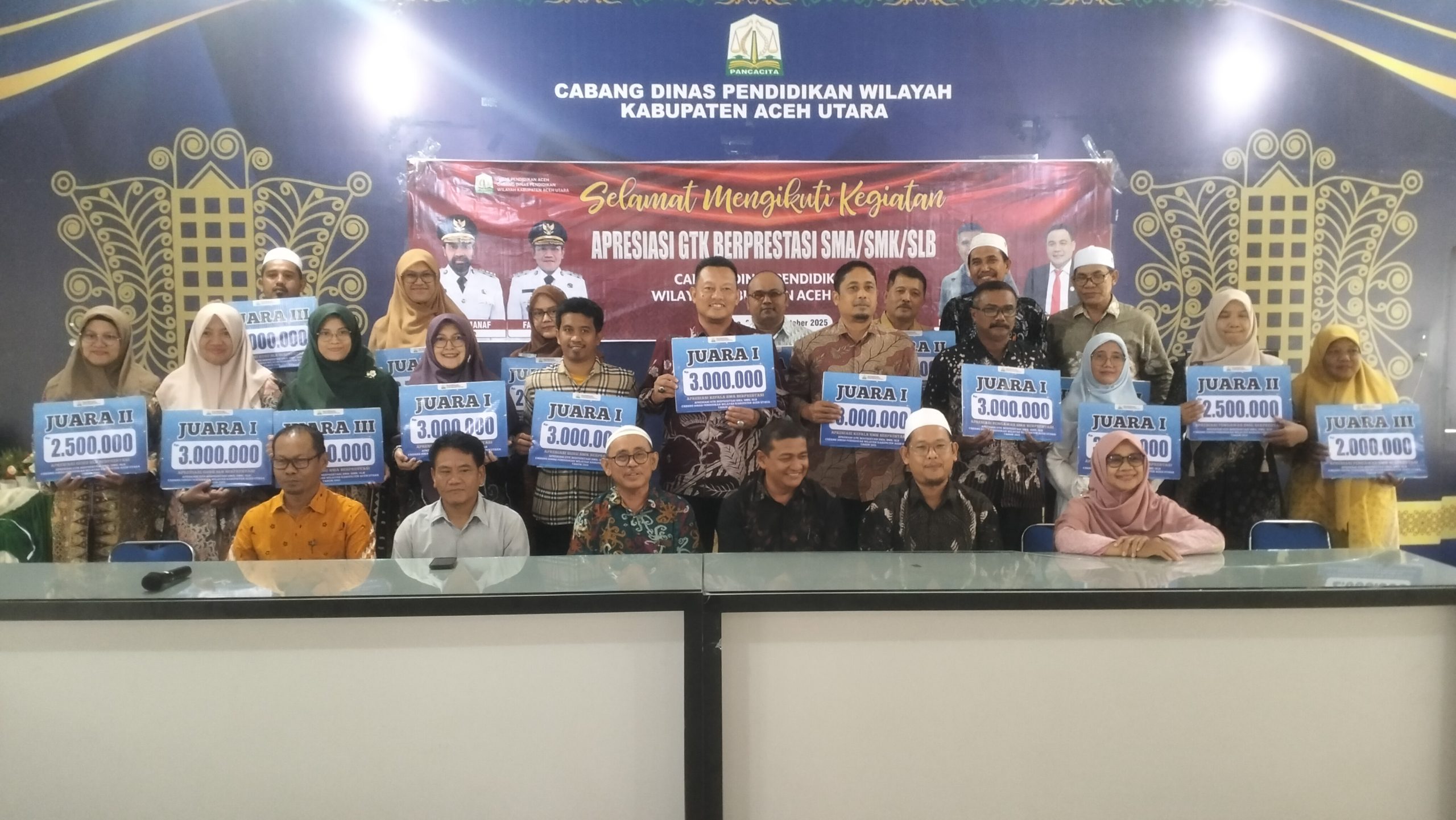 FaktaNews24.com, Aceh Utara – Dinas Pendidikan Aceh melalui Cabang Dinas Pendidikan Wilayah Aceh Utara kembali menggelar kegiatan Apresiasi Guru dan Tenaga Kependidikan (GTK) Berprestasi untuk SMA, SMK, dan SLB. Kegiatan berlangsung di kantor Cabang Dinas Aceh Utara di Lhoksukon, dari 24 hingga 25 Oktober 2025.
