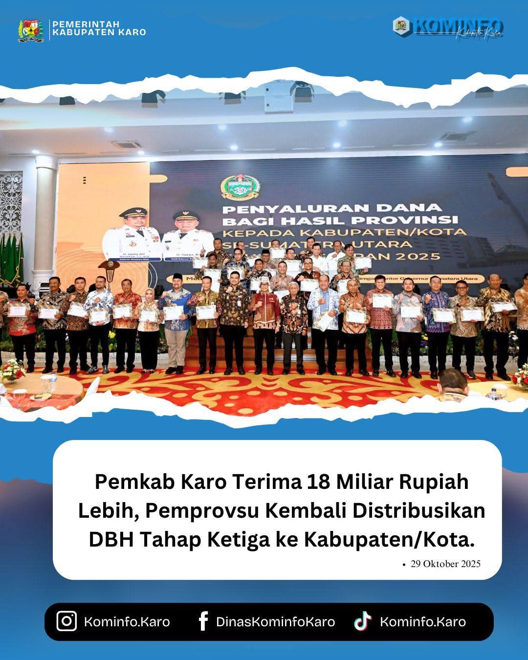 Bupati Karo Brigjen Pol (Purn) Dr.dr.Antonius Ginting, Sp.OG,M.Kes terima kekurangan Dana Bagi Hasil (DBH) Tahun 2023 – 2025 sebesar Rp18.180.394.546 dari Pemerintah Provinsi Sumatera Utara. Penyerahan DBH ini secara simbolis disampaikan Gubernur Sumatera Utara (Sumut) Muhammad Bobby Afif Nasution di Aula Tengku Rizal Nurdin, Kantor Gubernur Sumut, Jalan Diponegoro No. 30 Medan, Rabu (29/10/2025).