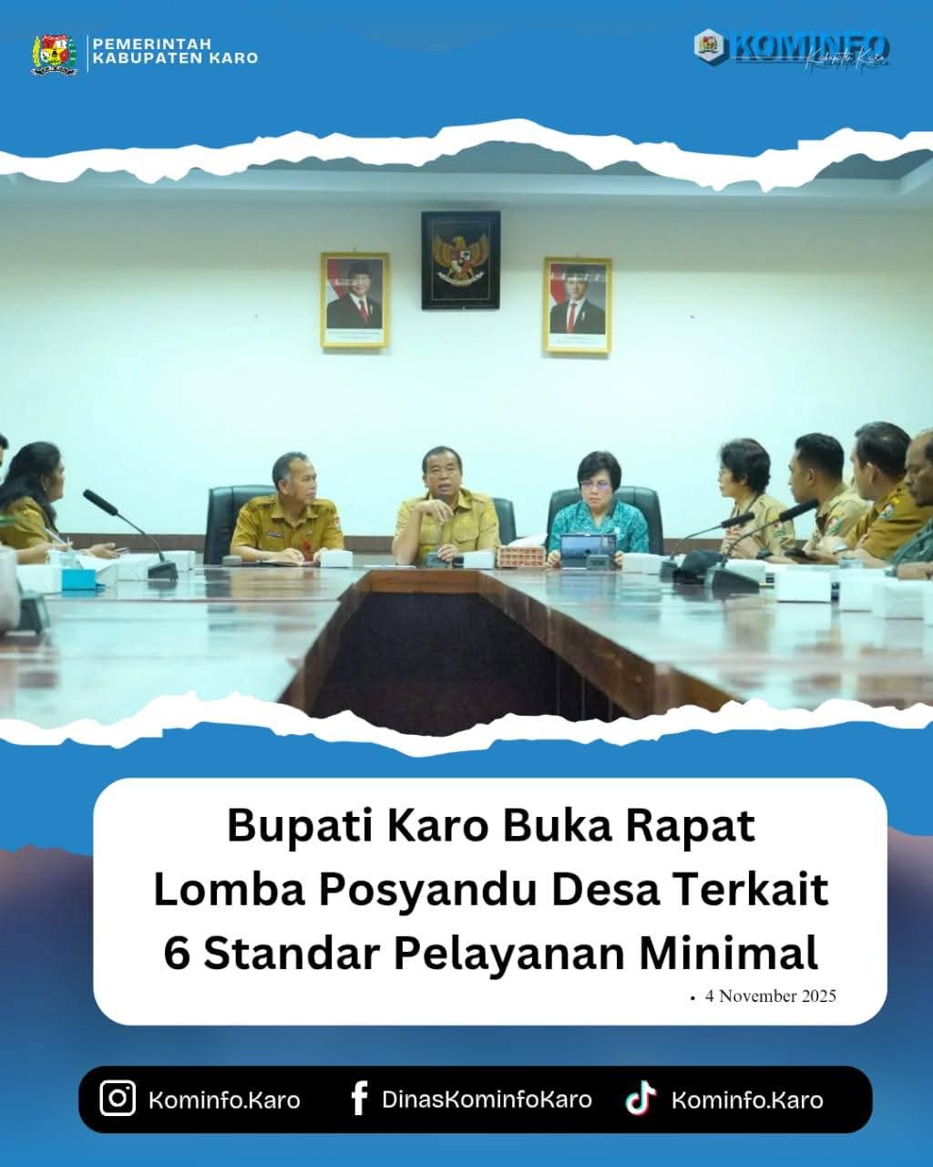 Bupati Karo, Brigjen Pol (Purn) Dr. dr. Antonius Ginting, Sp.OG., M.Kes., membuka secara resmi Rapat Lomba Posyandu Desa terkait 6 Standar Pelayanan Minimal (SPM) di Ruang Rapat Bupati Karo pada Selasa (4/11/2025)