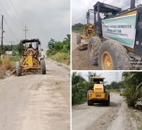 Dan menutup jalan yang berlobang dengan Mengunakan material kerikil dan langsung diratakan oleh alat berat jenis Geleder, supaya jalan lebih maksimal Pihak Perusahaan juga langsung melakukan Pengerasan jalan yang sudah diratakan dengan menurunkan Alat Berat jenis Bomak tersebut. Rabu, 21 Januari 2026.